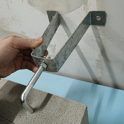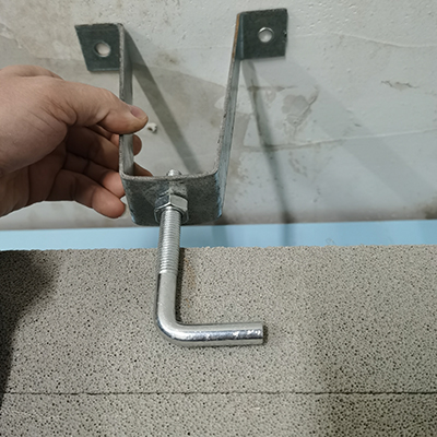 1、頂端與梁底用U型鐵件固定,將U型鐵件用射釘固定在梁底部,上端用木楔加固,用L型鐵件固定。